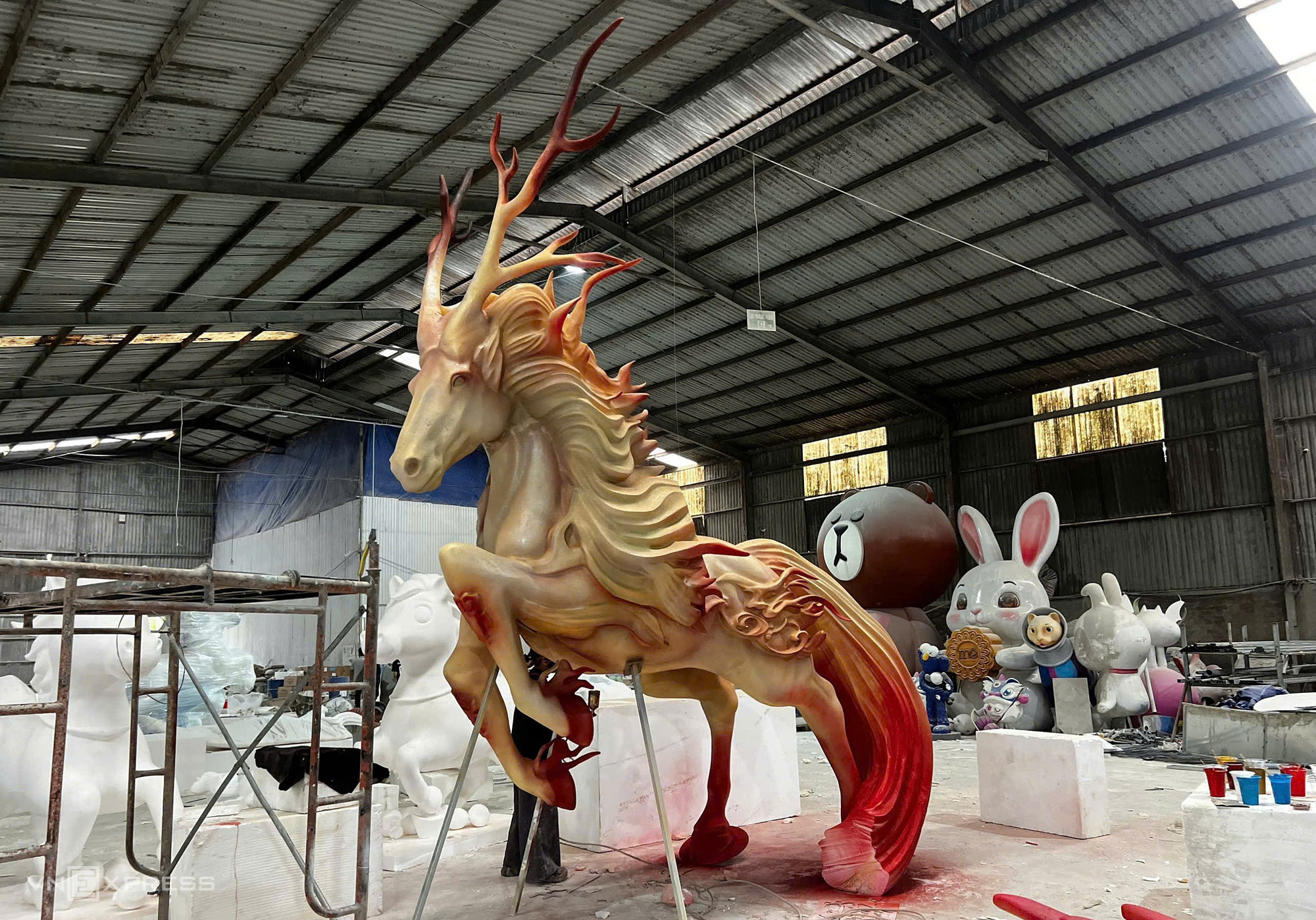 Après 10 jours de travail, le façonnage des deux mascottes est terminé ; elles attendent désormais la mise en peinture avant d'être livrées à des clients à Ho Chi Minh Ville la semaine prochaine.