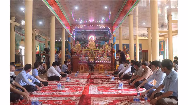 La délégation du Comité des affaires ethniques de l'Assemblée nationale rend visite et formule les voeux du Têt Chol Chnam Thmay à la pagode Rach Giông. Photo : VNA.