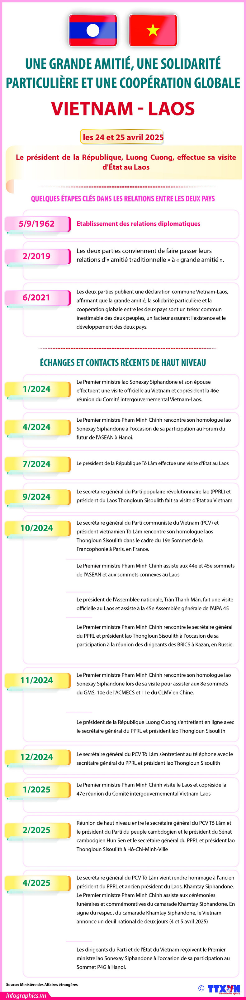Le président du Vietnam, Luong Cuong, effectue une visite d’État au Laos les 24 et 25 avril. Cette visite intervient à l’invitation de Thongloun Sisoulith, secrétaire général du Parti populaire révolutionnaire lao (PPRL) et président du Laos.