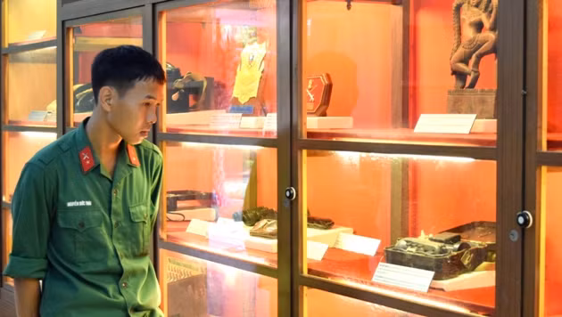 Un jeune soldat regarde attentivement les objets vestiges. Photo: Minh Duy/NDEL.