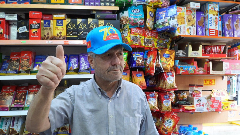 Un Algérien est heureux de recevoir en souvenir un chapeau avec la mention "70ème anniversaire de la victoire de Dien Bien Phu". Photo : VietnamPlus.
