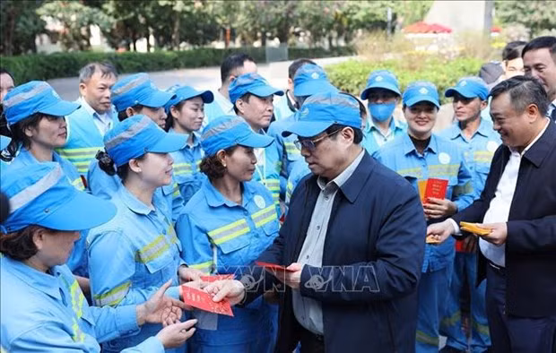 En rendant visite le Têt aux travailleurs de l'Entreprise d'Environnement Urbain de Hanoï (URENCO) qui nettoyaient les rues de Diên Biên Phu et Hoàng Diêu, le chef du gouvernement les a remerciés d'avoir travaillé pendant leurs vacances pour une capitale verte, propre et sûre.